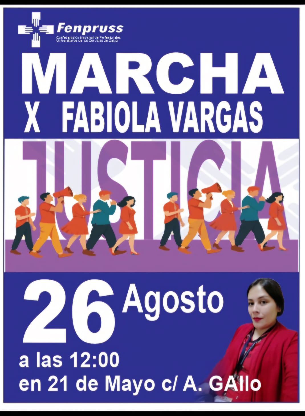 El próximo martes 26 de agosto, en el marco del Día Internacional de la Matronería, Fenpruss Arica convoca a una marcha ciudadana por las calles céntricas de la ciudad, en exigencia de justicia para nuestra socia y compañera Fabiola Vargas.
