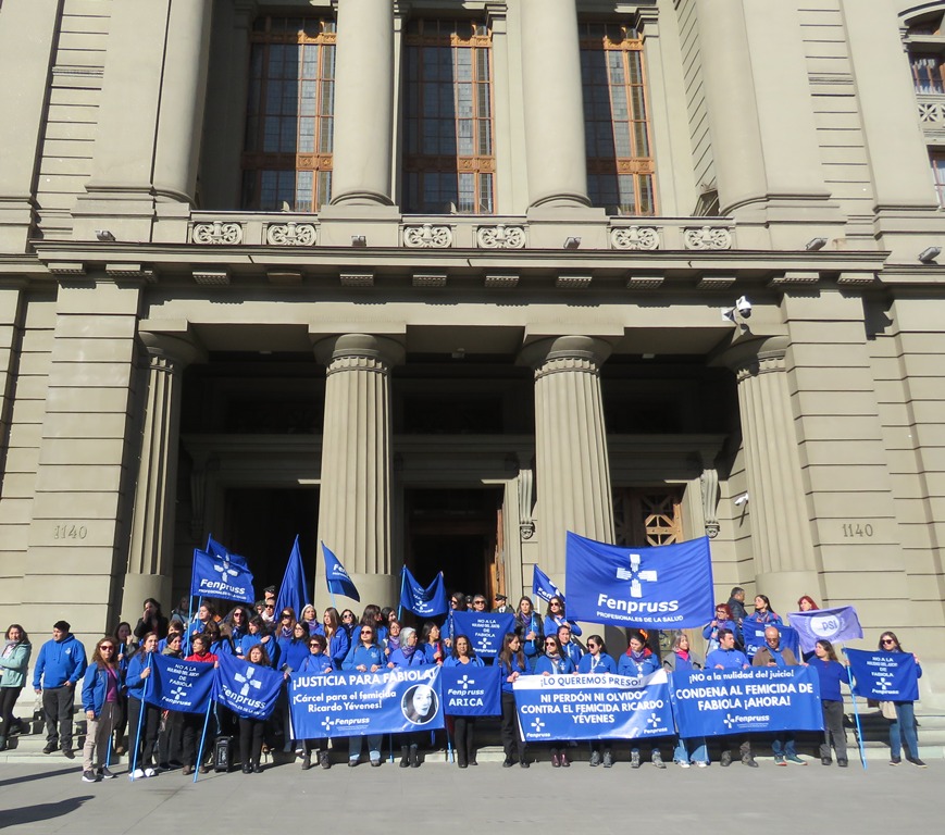 Hoy a las 11:30 hrs. Fenpruss se movilizó frente a los tribunales para exigir justicia para nuestra compañera y socia Fabiola Vargas, matrona y profesional de la salud, brutalmente asesinada a golpes por su pareja, el psiquiatra Ricardo Yévenes, en Arica.